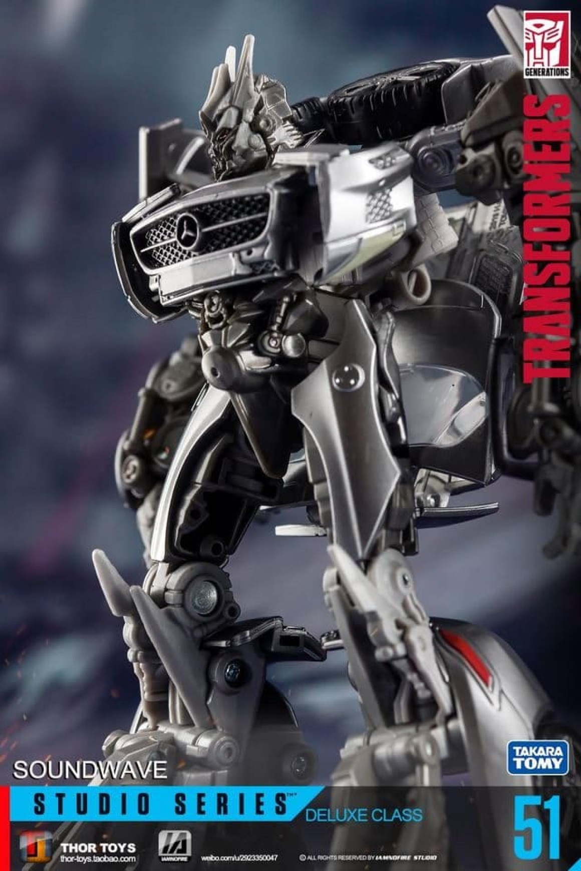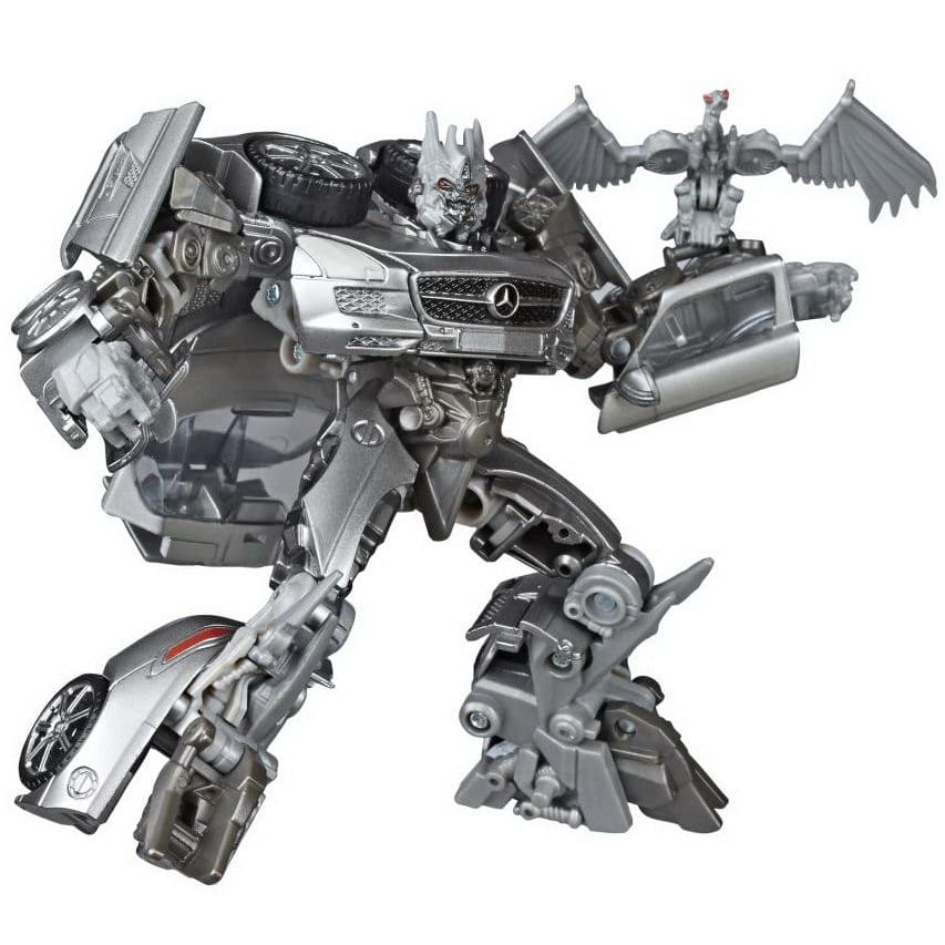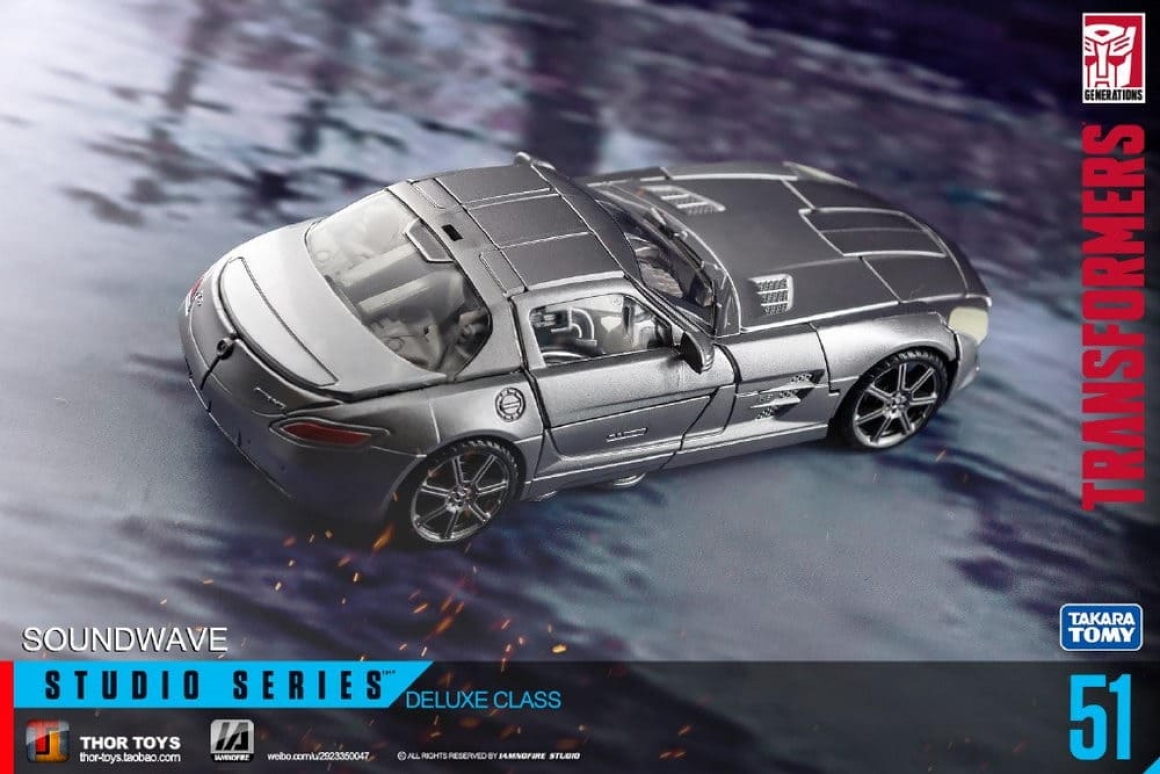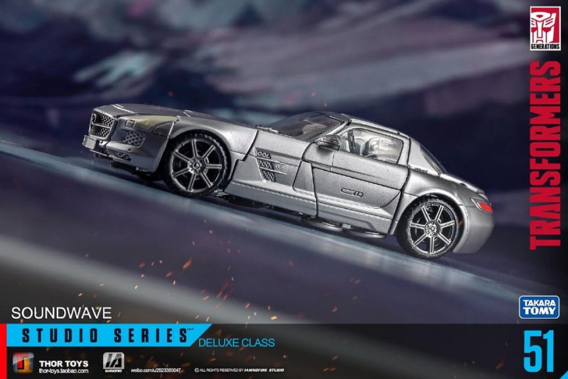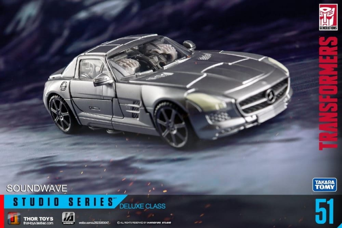 Studio Series 51 - это свежий взгляд на Саундвейва 2011 года: новый молд с точными пропорциями из цифровой модели фильма, включая плоский экран на груди и агрессивную позу. В отличие от Human Alliance версии (с большим Лазербиком и фигуркой человека), здесь акцент на компактности и кино-дизайне: Лазербик теперь мини-дрон, который не только крепится на руку, но и трансформируется в кассету для хранения в груди. Альт-мод - стильный Mercedes SLS AMG с открывающимися дверями, вращающимися колёсами и логотипами, без лишнего хлама. Суставы тугие: двойные колени, поворот головы на 180 градусов, руки с шарнирами для хватки оружия. Пружина выстреливания Лазербика добавляет fun-фактора, как в G1, но с байевским шиком. Короче, это не ремастер, а апгрейд.