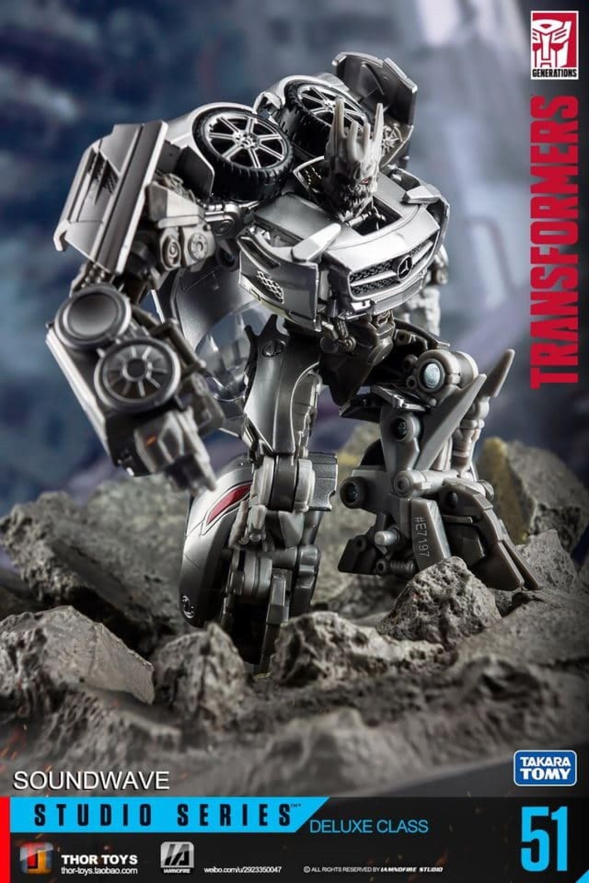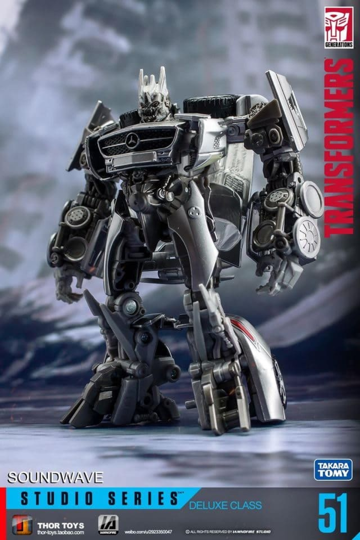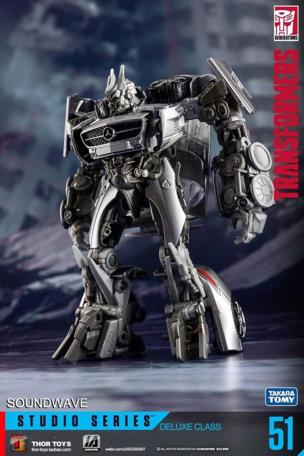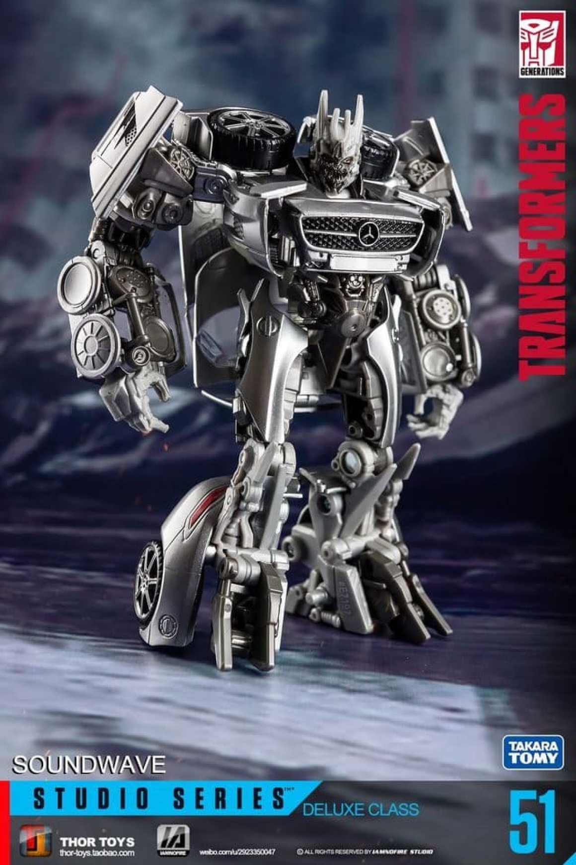 Studio Series 51 - это свежий взгляд на Саундвейва 2011 года: новый молд с точными пропорциями из цифровой модели фильма, включая плоский экран на груди и агрессивную позу. В отличие от Human Alliance версии (с большим Лазербиком и фигуркой человека), здесь акцент на компактности и кино-дизайне: Лазербик теперь мини-дрон, который не только крепится на руку, но и трансформируется в кассету для хранения в груди. Альт-мод - стильный Mercedes SLS AMG с открывающимися дверями, вращающимися колёсами и логотипами, без лишнего хлама. Суставы тугие: двойные колени, поворот головы на 180 градусов, руки с шарнирами для хватки оружия. Пружина выстреливания Лазербика добавляет fun-фактора, как в G1, но с байевским шиком. Короче, это не ремастер, а апгрейд.